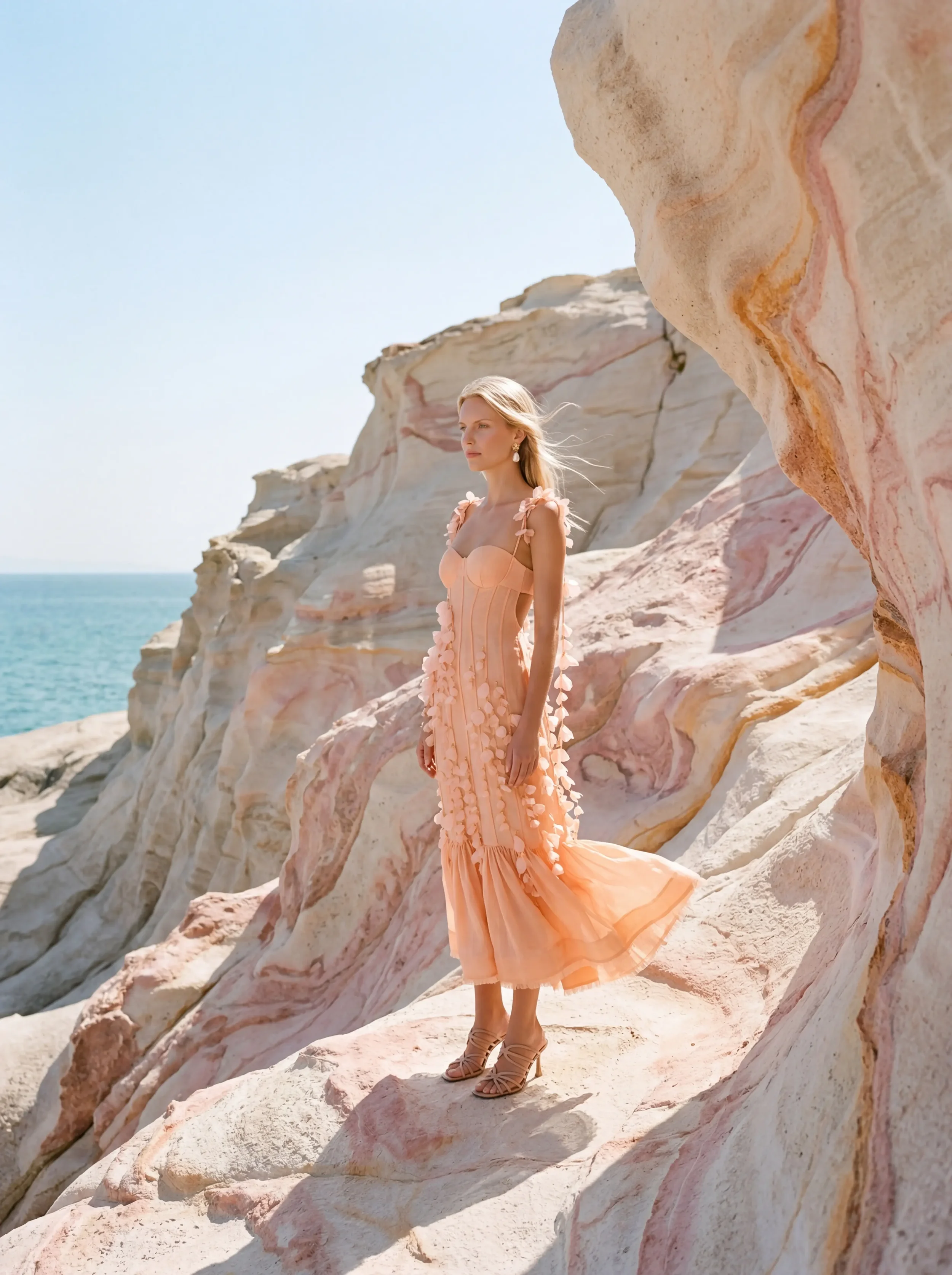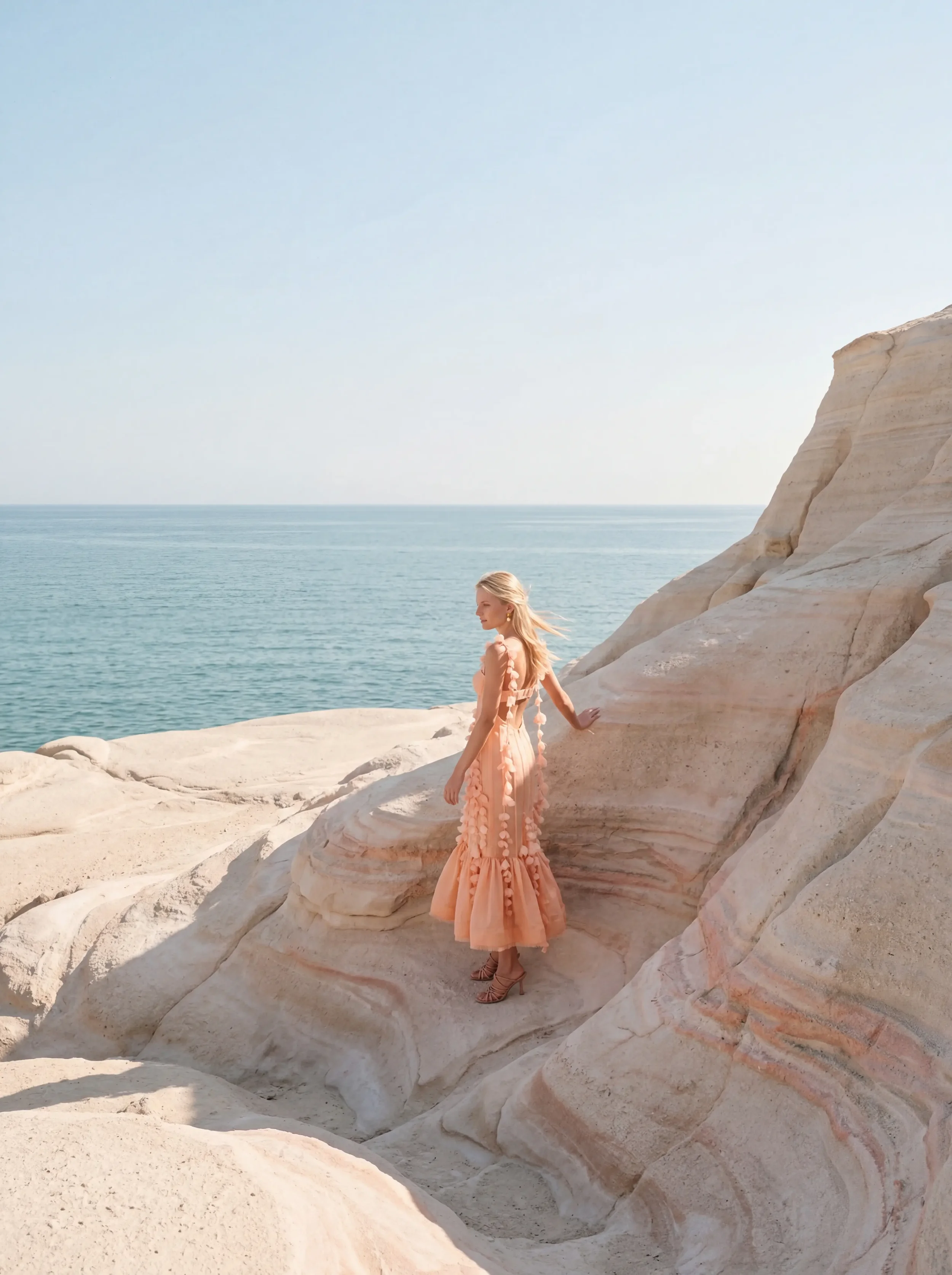 Il brief immaginario era preciso: rocce calcaree con venature rosa, luce radente del tardo pomeriggio, abito pesca in chiffon con applicazioni floreali, modella bionda con capelli al vento, mare turchese sfocato sullo sfondo. Un'estetica da editorial di Vogue Australia, con quella tensione tra natura selvaggia e raffinatezza sartoriale che Zimmermann sa evocare meglio di chiunque altro.